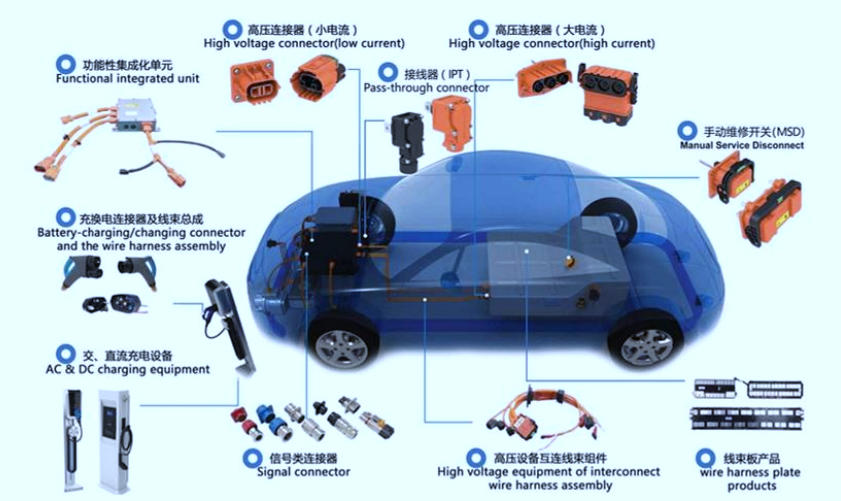 汽车连接器主要分为低压连接器、高压连接器和高速连接器三种。按照传输介质的不同,汽车连接器 可以分为传输交换数据信号的高速连接器和传输交换电流的电连接器,根据工作电压的不同,电连接器可 以进一步划分为低压连接器和高压连接器。低压连接器通常用于传统燃油车的 BMS、空调系统、车灯等领 域;高压连接器普遍用于新能源汽车的电池、高压配电盒、空调、直/交流充电接口、充电枪、充电座等;高速连接器主要用于需要高频高速处理的功能,如摄像头、传感器、广播天线、GPS、蓝牙、WiFi、无钥匙 进入、信息娱乐系统、导航与驾驶辅助系统等。